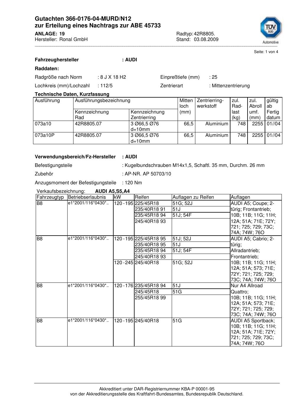 Dieses Gutachten (abe) bezieht sich auf die Alufelge brand-ronal 42R8805 in der Ausführung 8Jx18 ET 0, Mittenloch 0 mm (KBA 45733). Im PDF findest du typischerweise zulässige Reifengrößen, Auflagen/Anbauhinweise und – je nach Dokument – Hinweise zur Eintragung.