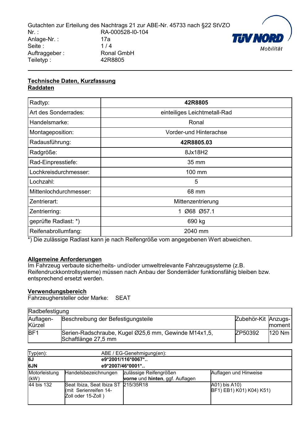 Dieses Gutachten (abe) bezieht sich auf die Alufelge brand-ronal 42R8805 in der Ausführung 8Jx18 ET 0, Mittenloch 0 mm (KBA 45733). Im PDF findest du typischerweise zulässige Reifengrößen, Auflagen/Anbauhinweise und – je nach Dokument – Hinweise zur Eintragung.