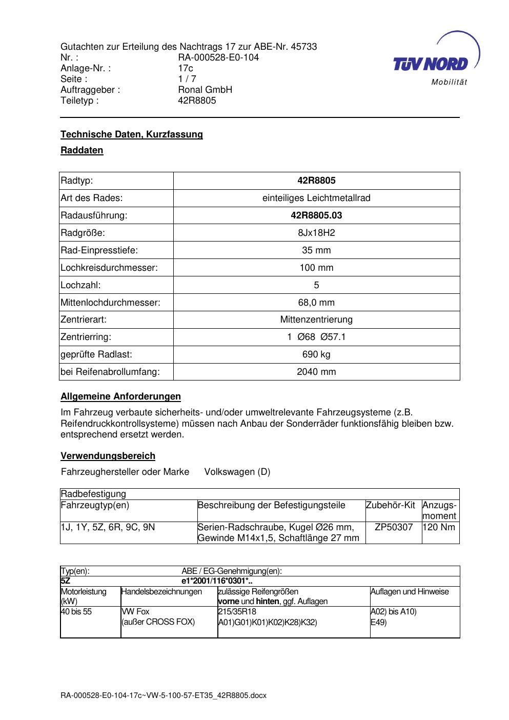 Dieses Gutachten (abe) bezieht sich auf die Alufelge brand-ronal 42R8805 in der Ausführung 8Jx18 ET 0, Mittenloch 0 mm (KBA 45733). Im PDF findest du typischerweise zulässige Reifengrößen, Auflagen/Anbauhinweise und – je nach Dokument – Hinweise zur Eintragung.