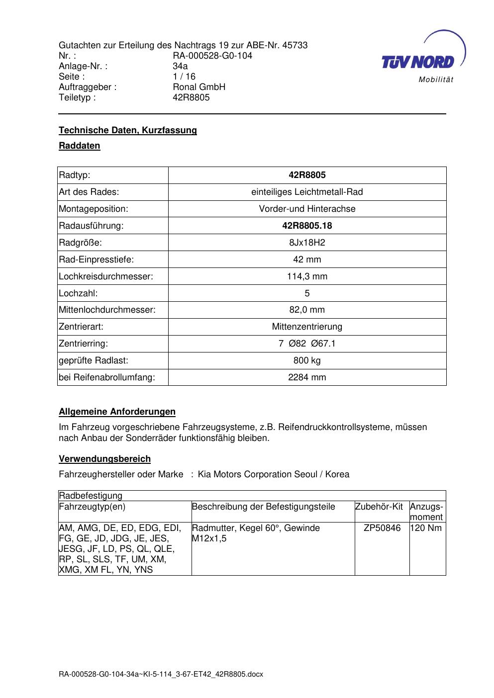 Dieses Gutachten (abe) bezieht sich auf die Alufelge brand-ronal 42R8805 in der Ausführung 8Jx18 ET 0, Mittenloch 0 mm (KBA 45733). Im PDF findest du typischerweise zulässige Reifengrößen, Auflagen/Anbauhinweise und – je nach Dokument – Hinweise zur Eintragung.
