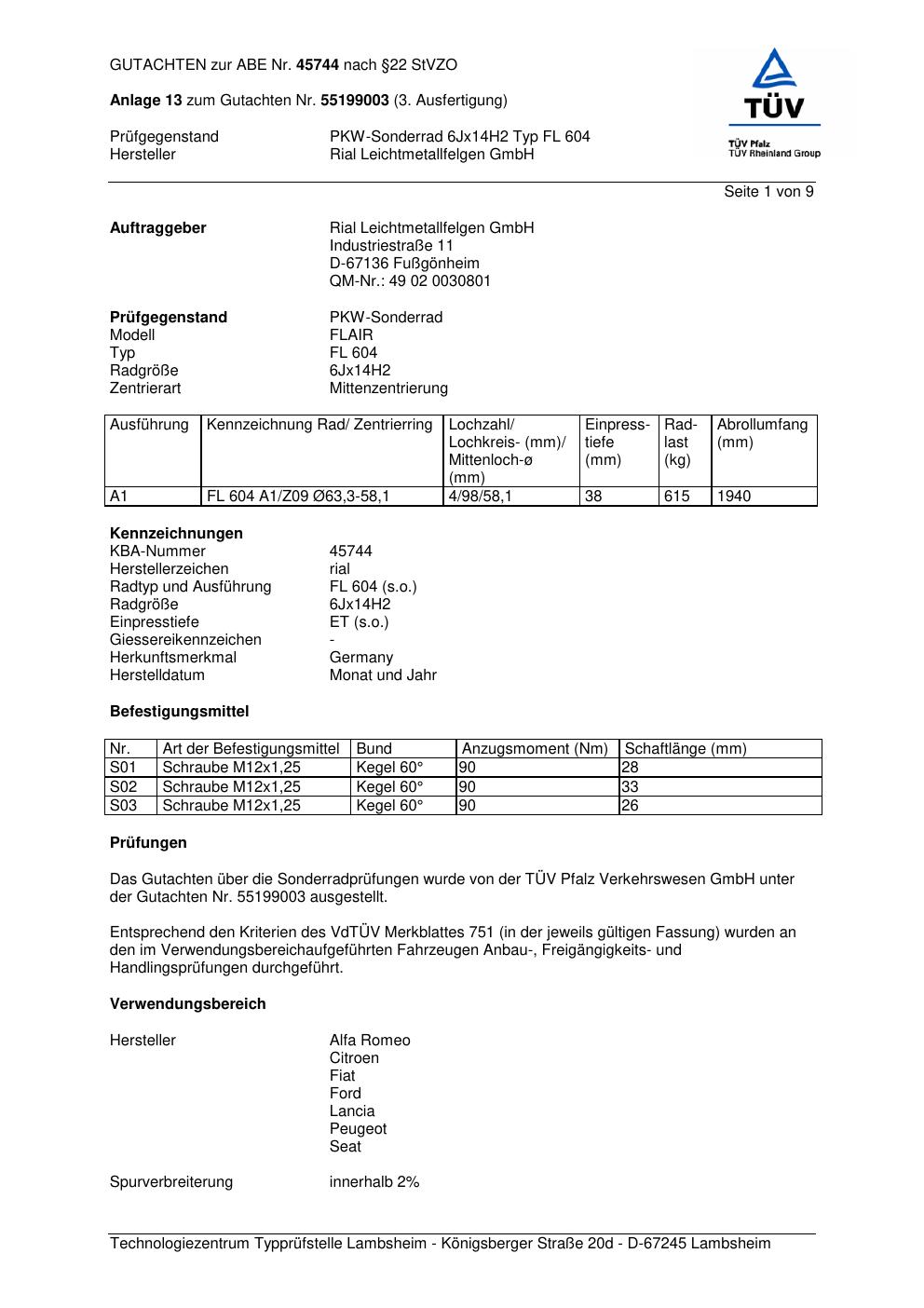 Dieses Gutachten (abe) bezieht sich auf die Alufelge brand-rial FL 604 in der Ausführung 6Jx14 ET 0, Mittenloch 0 mm (KBA 45744). Im PDF findest du typischerweise zulässige Reifengrößen, Auflagen/Anbauhinweise und – je nach Dokument – Hinweise zur Eintragung.