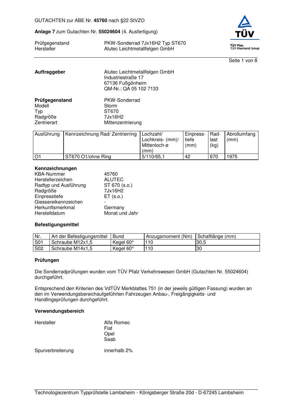 Dieses Gutachten (abe) bezieht sich auf die Alufelge ALUTEC ST670 in der Ausführung 7Jx16 ET 0, Mittenloch 0 mm (KBA 45760). Im PDF findest du typischerweise zulässige Reifengrößen, Auflagen/Anbauhinweise und – je nach Dokument – Hinweise zur Eintragung.