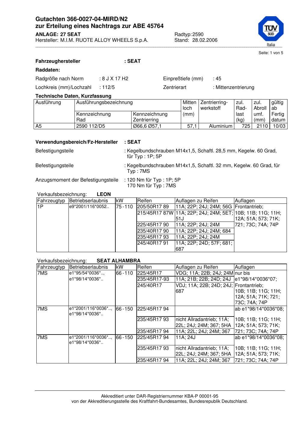 Dieses Gutachten (abe) bezieht sich auf die Alufelge ATS 2590 in der Ausführung 8Jx17 ET 0, Mittenloch 0 mm (KBA 45764). Im PDF findest du typischerweise zulässige Reifengrößen, Auflagen/Anbauhinweise und – je nach Dokument – Hinweise zur Eintragung.