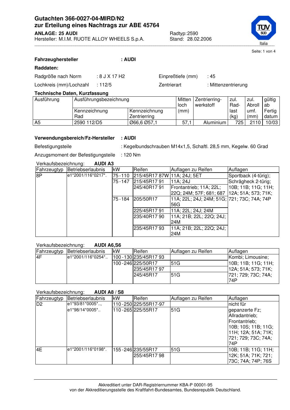 Dieses Gutachten (abe) bezieht sich auf die Alufelge ATS 2590 in der Ausführung 8Jx17 ET 0, Mittenloch 0 mm (KBA 45764). Im PDF findest du typischerweise zulässige Reifengrößen, Auflagen/Anbauhinweise und – je nach Dokument – Hinweise zur Eintragung.