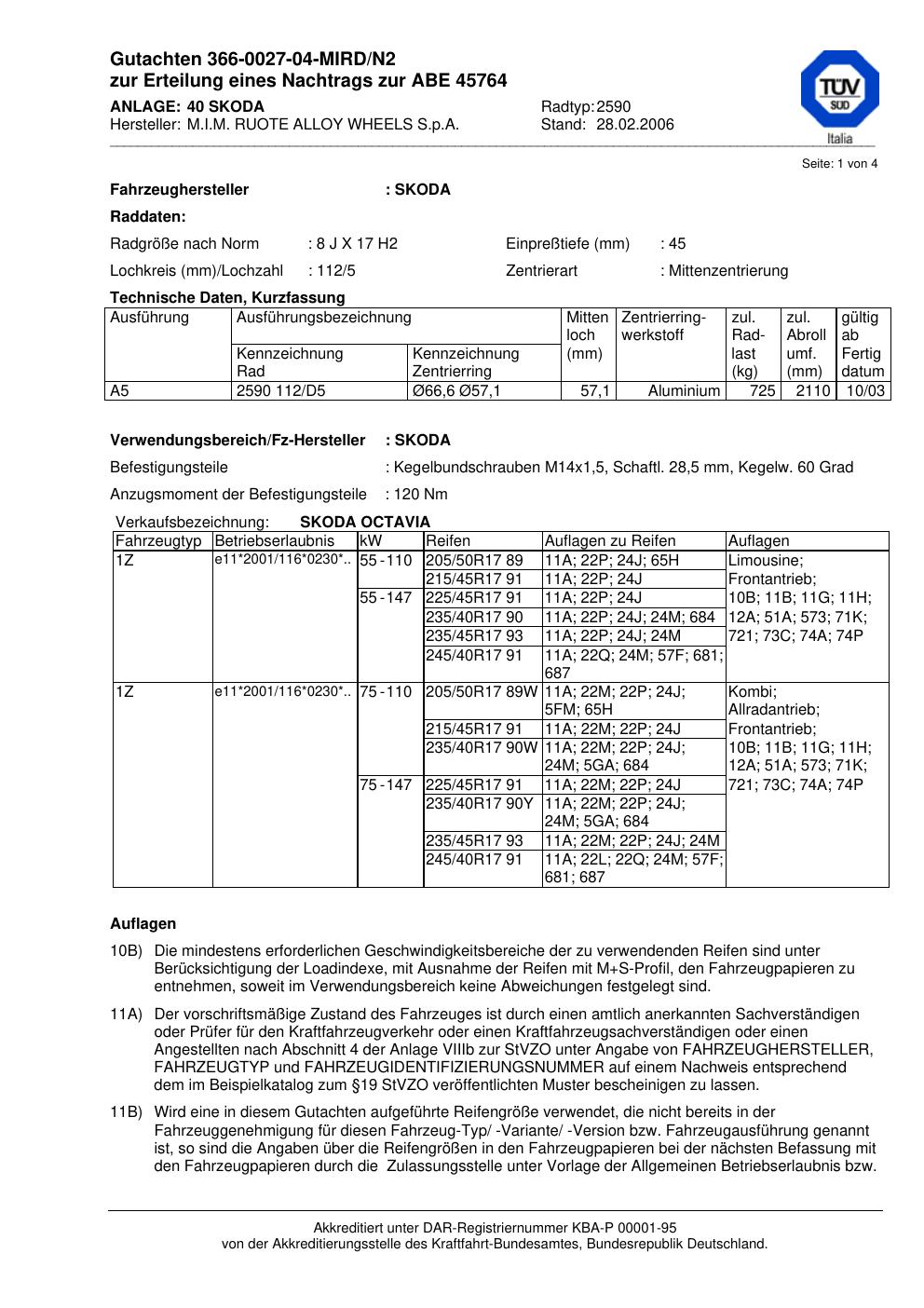 Dieses Gutachten (abe) bezieht sich auf die Alufelge ATS 2590 in der Ausführung 8Jx17 ET 0, Mittenloch 0 mm (KBA 45764). Im PDF findest du typischerweise zulässige Reifengrößen, Auflagen/Anbauhinweise und – je nach Dokument – Hinweise zur Eintragung.