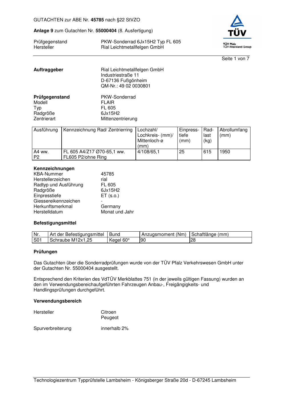 Dieses Gutachten (abe) bezieht sich auf die Alufelge brand-rial FL 605 in der Ausführung 6Jx15 ET 0, Mittenloch 0 mm (KBA 45785). Im PDF findest du typischerweise zulässige Reifengrößen, Auflagen/Anbauhinweise und – je nach Dokument – Hinweise zur Eintragung.