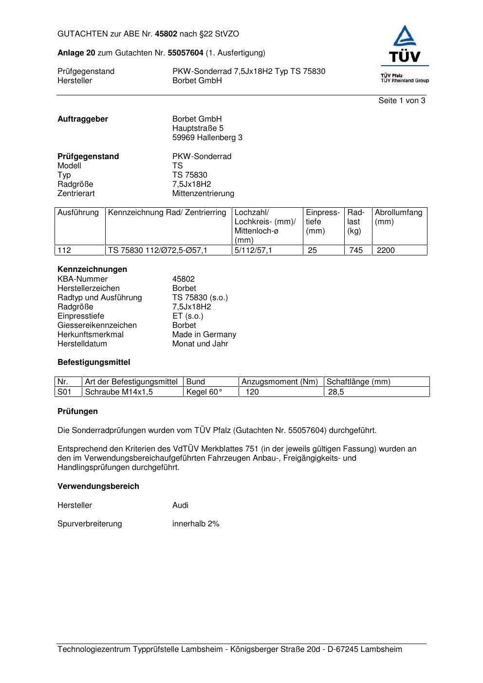 Dieses Gutachten (abe) bezieht sich auf die Alufelge brand-borbet TS 75830 in der Ausführung 7.5Jx18 ET 0, Mittenloch 0 mm (KBA 45802). Im PDF findest du typischerweise zulässige Reifengrößen, Auflagen/Anbauhinweise und – je nach Dokument – Hinweise zur Eintragung.
