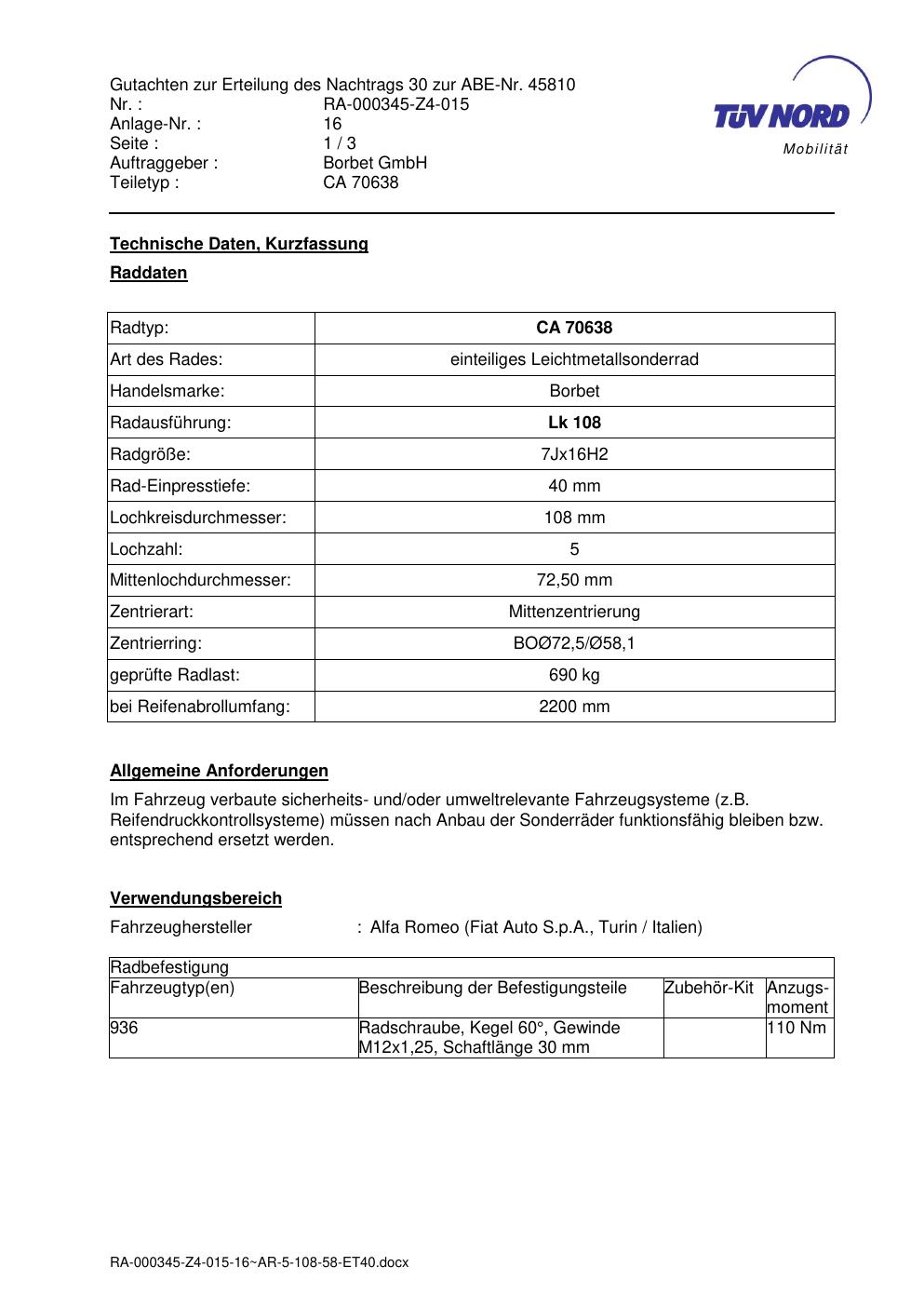Dieses Gutachten (abe) bezieht sich auf die Alufelge Borbet CA 70638 in der Ausführung 7Jx16 ET 0, Mittenloch 0 mm (KBA 45810). Im PDF findest du typischerweise zulässige Reifengrößen, Auflagen/Anbauhinweise und – je nach Dokument – Hinweise zur Eintragung.