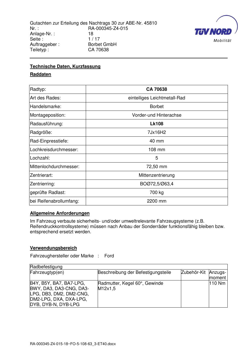 • Stimmt die KBA-Nummer auf der Felge mit diesem Dokument überein?