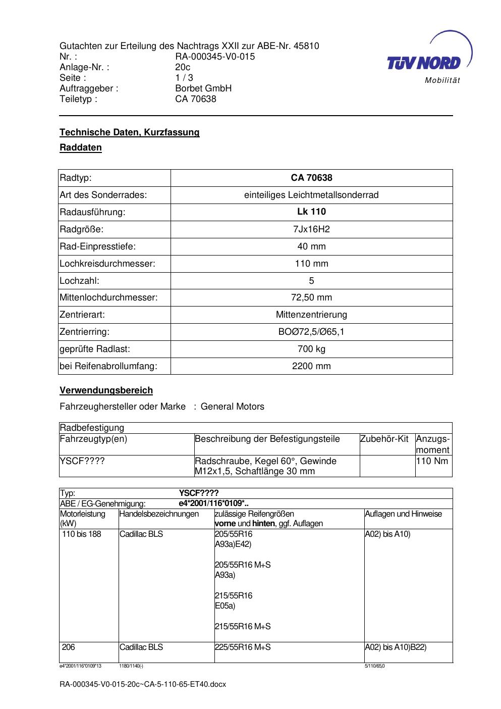 Dieses Gutachten (abe) bezieht sich auf die Alufelge Borbet CA 70638 in der Ausführung 7Jx16 ET 0, Mittenloch 0 mm (KBA 45810). Im PDF findest du typischerweise zulässige Reifengrößen, Auflagen/Anbauhinweise und – je nach Dokument – Hinweise zur Eintragung.