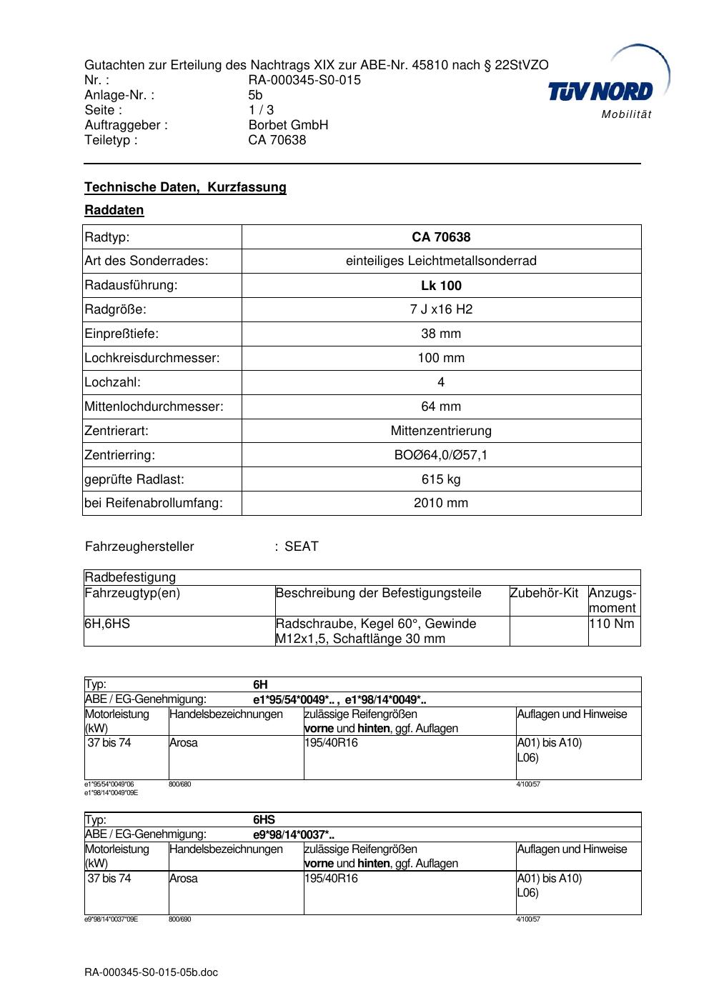 Dieses Gutachten (abe) bezieht sich auf die Alufelge Borbet CA 70638 in der Ausführung 7Jx16 ET 0, Mittenloch 0 mm (KBA 45810). Im PDF findest du typischerweise zulässige Reifengrößen, Auflagen/Anbauhinweise und – je nach Dokument – Hinweise zur Eintragung.