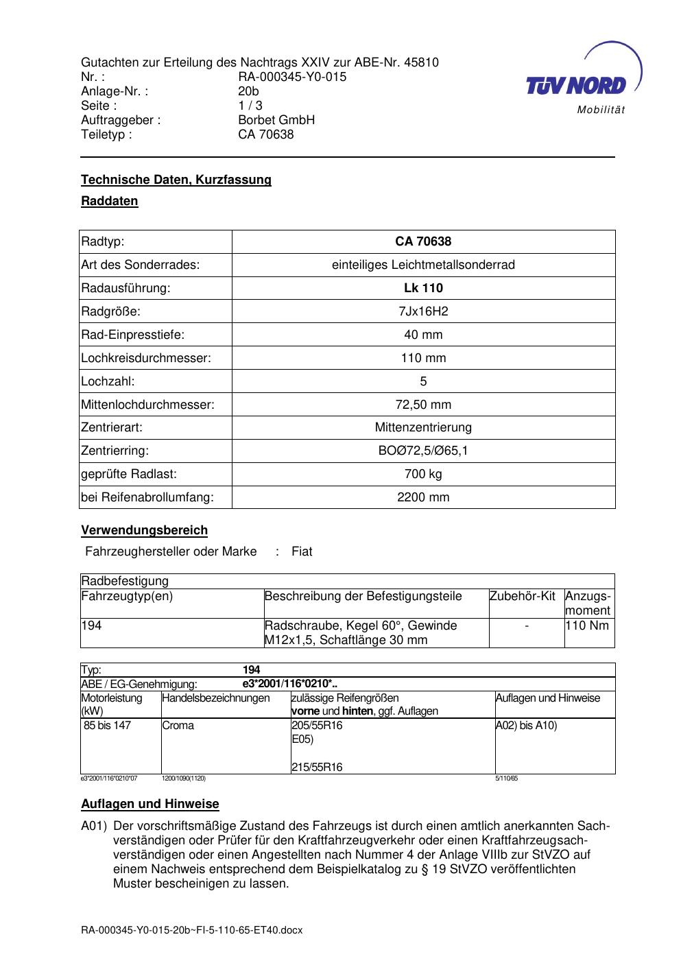 Dieses Gutachten (abe) bezieht sich auf die Alufelge Borbet CA 70638 in der Ausführung 7Jx16 ET 0, Mittenloch 0 mm (KBA 45810). Im PDF findest du typischerweise zulässige Reifengrößen, Auflagen/Anbauhinweise und – je nach Dokument – Hinweise zur Eintragung.