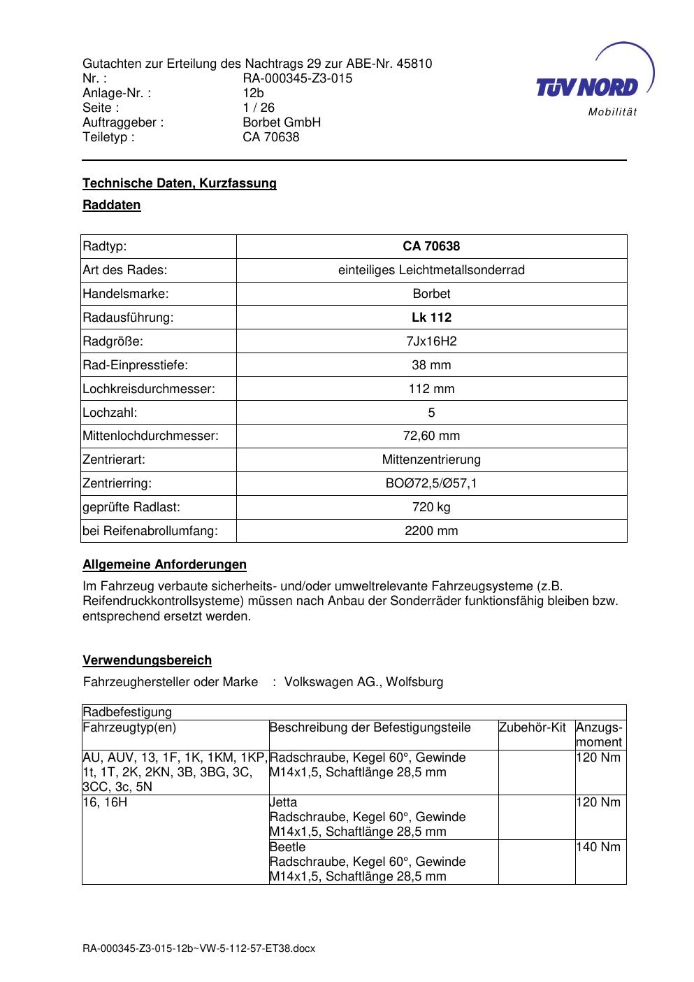 Dieses Gutachten (abe) bezieht sich auf die Alufelge Borbet CA 70638 in der Ausführung 7Jx16 ET 0, Mittenloch 0 mm (KBA 45810). Im PDF findest du typischerweise zulässige Reifengrößen, Auflagen/Anbauhinweise und – je nach Dokument – Hinweise zur Eintragung.