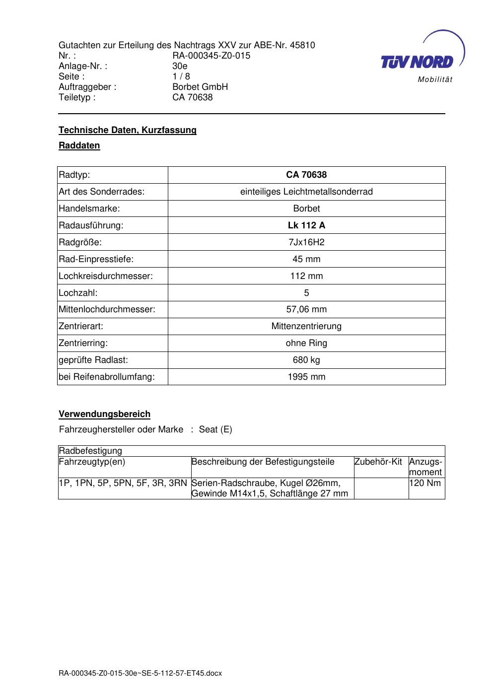Dieses Gutachten (abe) bezieht sich auf die Alufelge Borbet CA 70638 in der Ausführung 7Jx16 ET 0, Mittenloch 0 mm (KBA 45810). Im PDF findest du typischerweise zulässige Reifengrößen, Auflagen/Anbauhinweise und – je nach Dokument – Hinweise zur Eintragung.