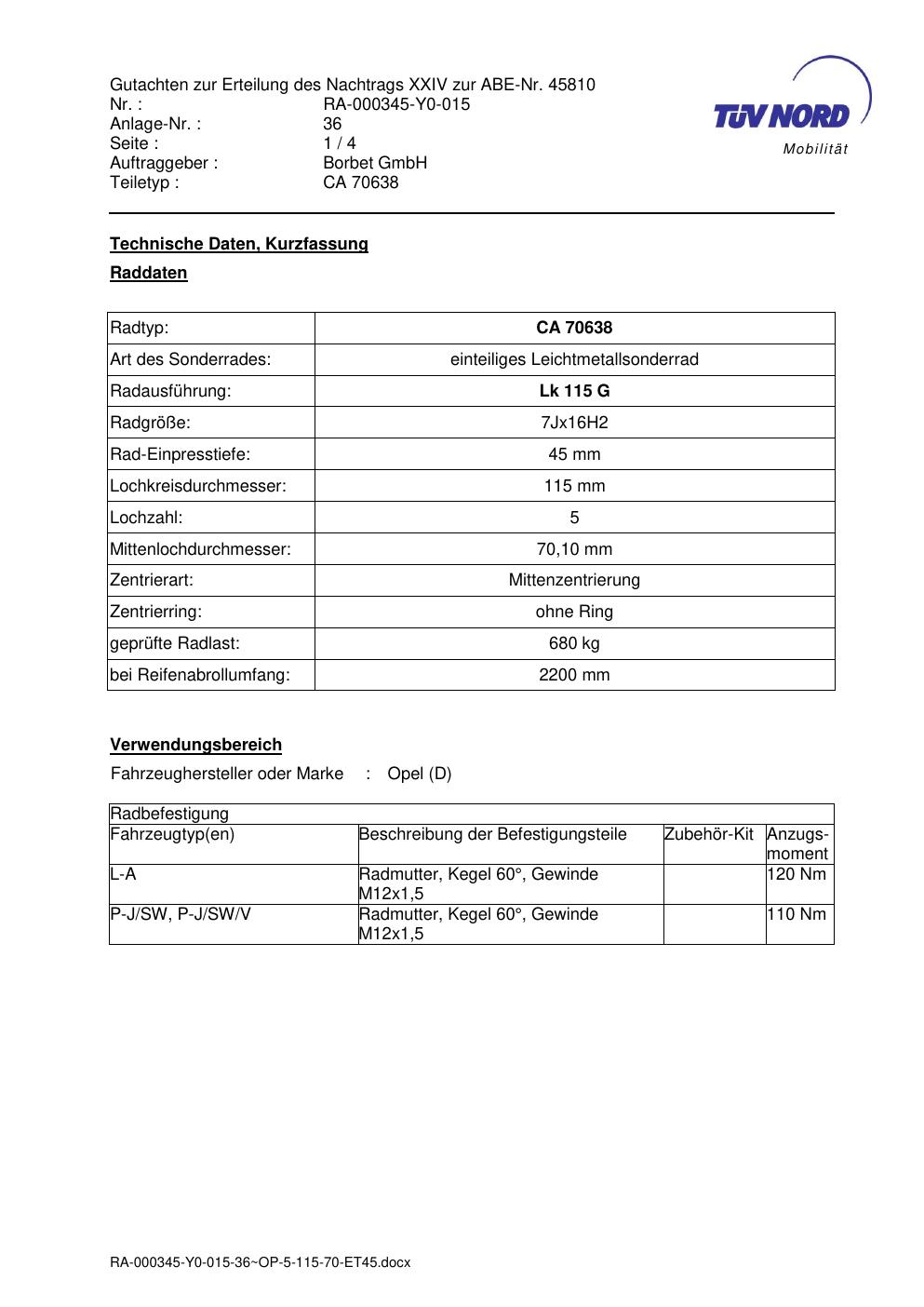 Dieses Gutachten (abe) bezieht sich auf die Alufelge Borbet CA 70638 in der Ausführung 7Jx16 ET 0, Mittenloch 0 mm (KBA 45810). Im PDF findest du typischerweise zulässige Reifengrößen, Auflagen/Anbauhinweise und – je nach Dokument – Hinweise zur Eintragung.