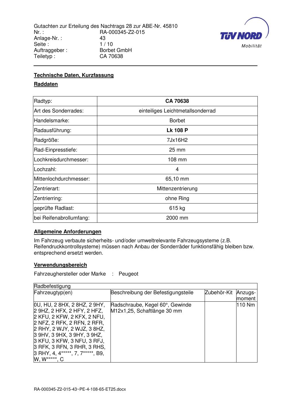 Dieses Gutachten (abe) bezieht sich auf die Alufelge Borbet CA 70638 in der Ausführung 7Jx16 ET 0, Mittenloch 0 mm (KBA 45810). Im PDF findest du typischerweise zulässige Reifengrößen, Auflagen/Anbauhinweise und – je nach Dokument – Hinweise zur Eintragung.