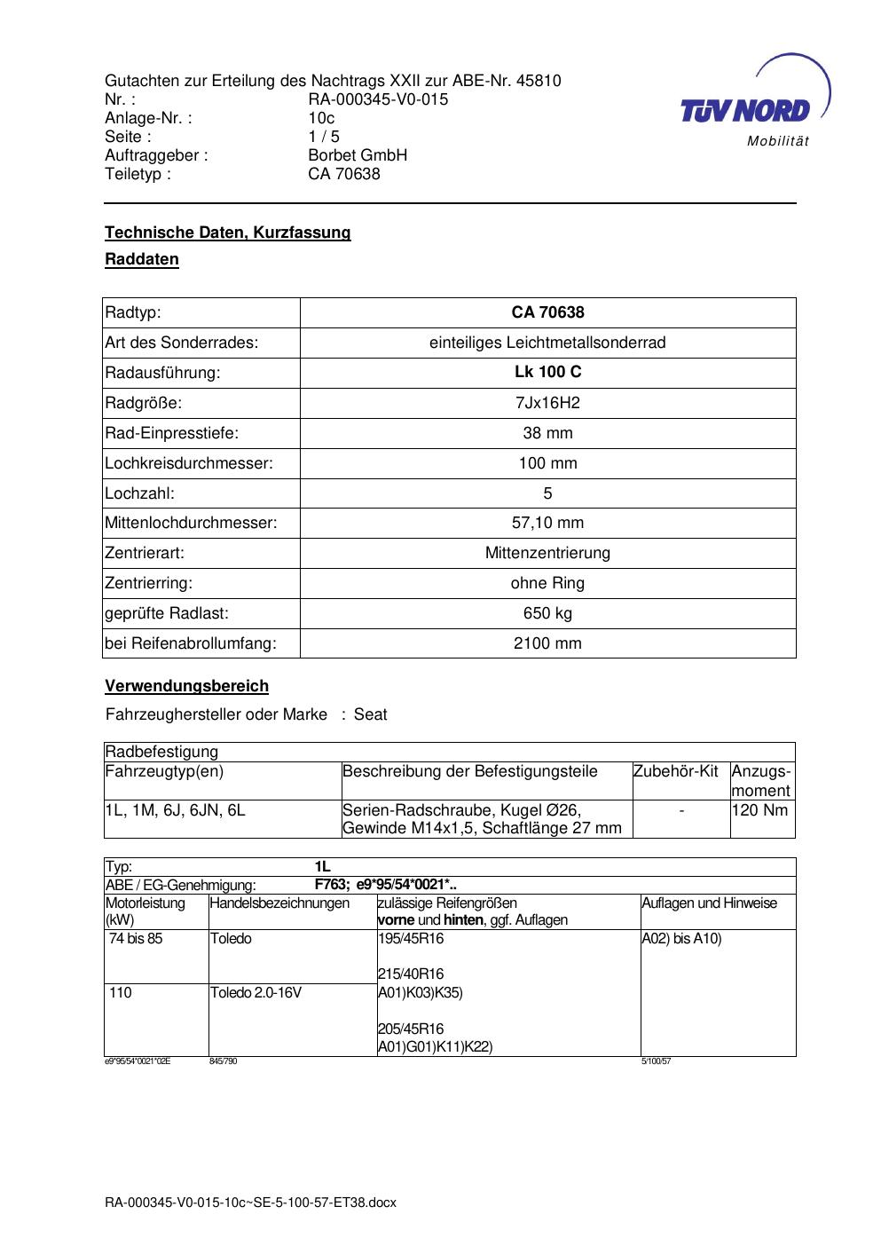 Dieses Gutachten (abe) bezieht sich auf die Alufelge Borbet CA 70638 in der Ausführung 7Jx16 ET 0, Mittenloch 0 mm (KBA 45810). Im PDF findest du typischerweise zulässige Reifengrößen, Auflagen/Anbauhinweise und – je nach Dokument – Hinweise zur Eintragung.