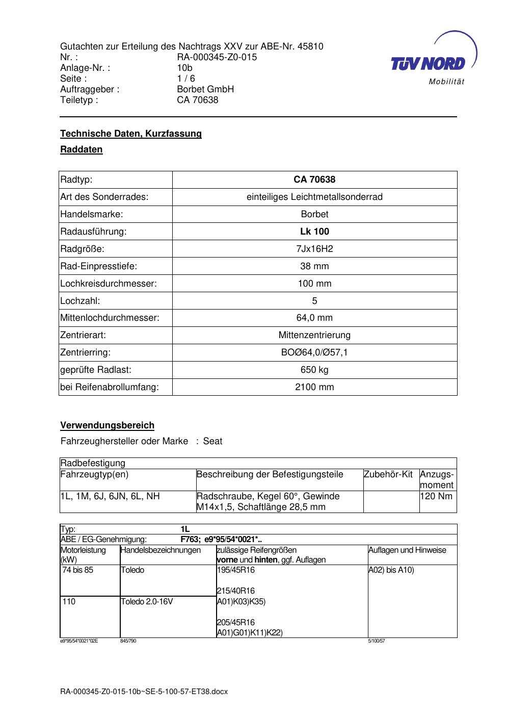 Dieses Gutachten (abe) bezieht sich auf die Alufelge Borbet CA 70638 in der Ausführung 7Jx16 ET 0, Mittenloch 0 mm (KBA 45810). Im PDF findest du typischerweise zulässige Reifengrößen, Auflagen/Anbauhinweise und – je nach Dokument – Hinweise zur Eintragung.