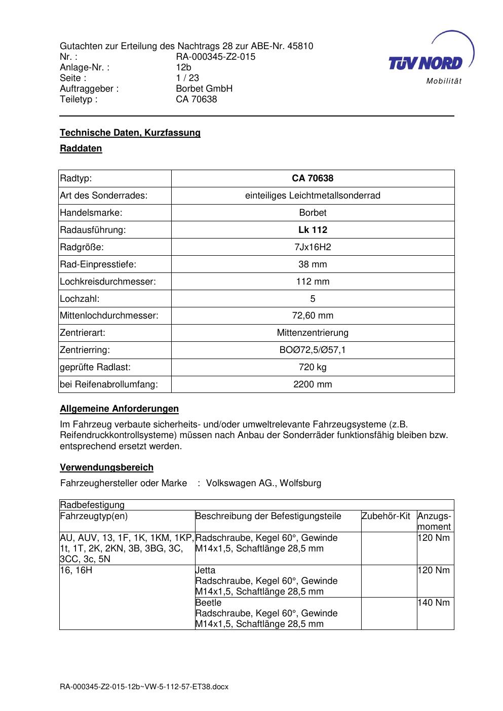 Dieses Gutachten (abe) bezieht sich auf die Alufelge Borbet CA 70638 in der Ausführung 7Jx16 ET 0, Mittenloch 0 mm (KBA 45810). Im PDF findest du typischerweise zulässige Reifengrößen, Auflagen/Anbauhinweise und – je nach Dokument – Hinweise zur Eintragung.
