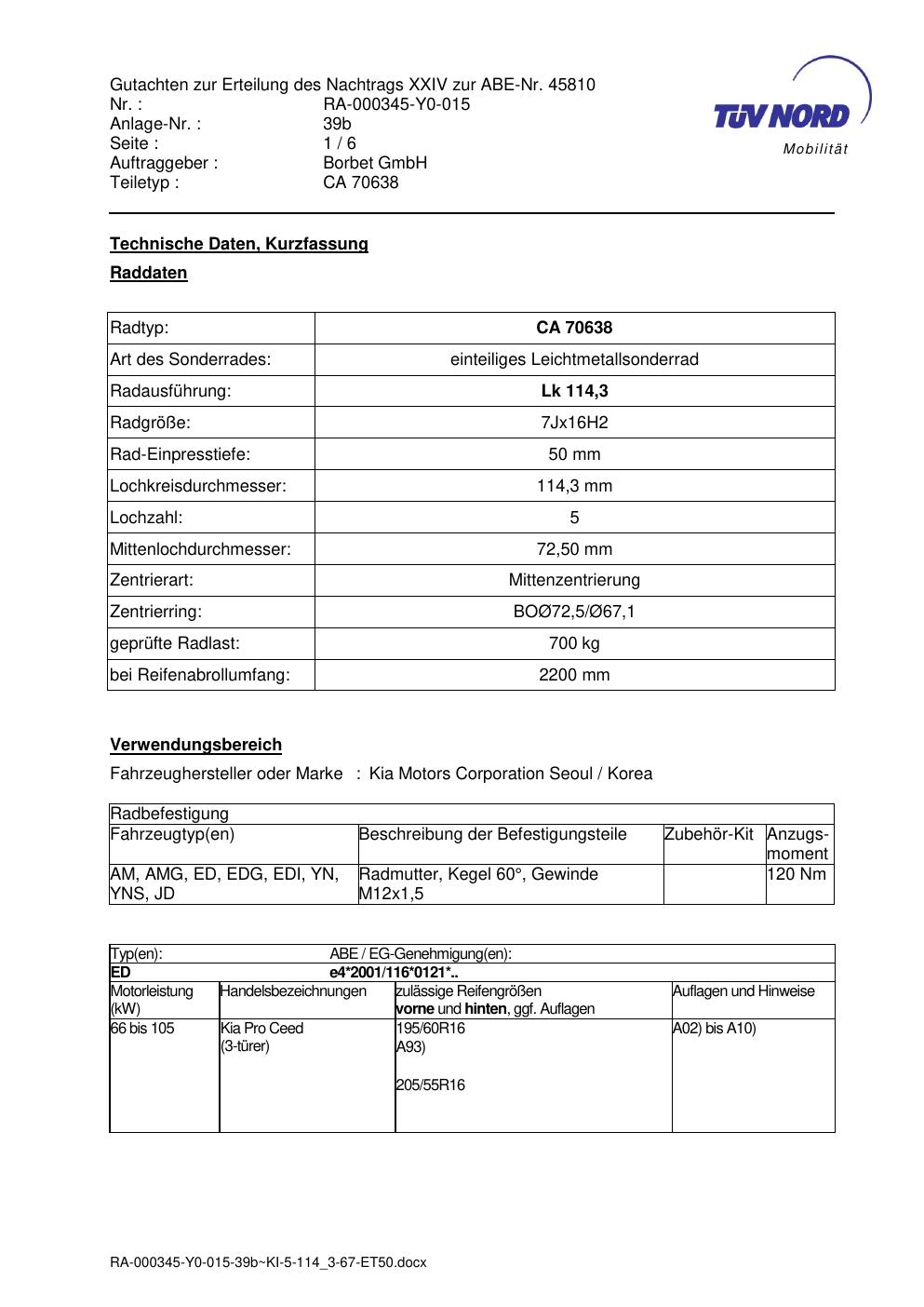 Dieses Gutachten (abe) bezieht sich auf die Alufelge brand-borbet CA 70638 in der Ausführung 7Jx16 ET 0, Mittenloch 0 mm (KBA 45810). Im PDF findest du typischerweise zulässige Reifengrößen, Auflagen/Anbauhinweise und – je nach Dokument – Hinweise zur Eintragung.