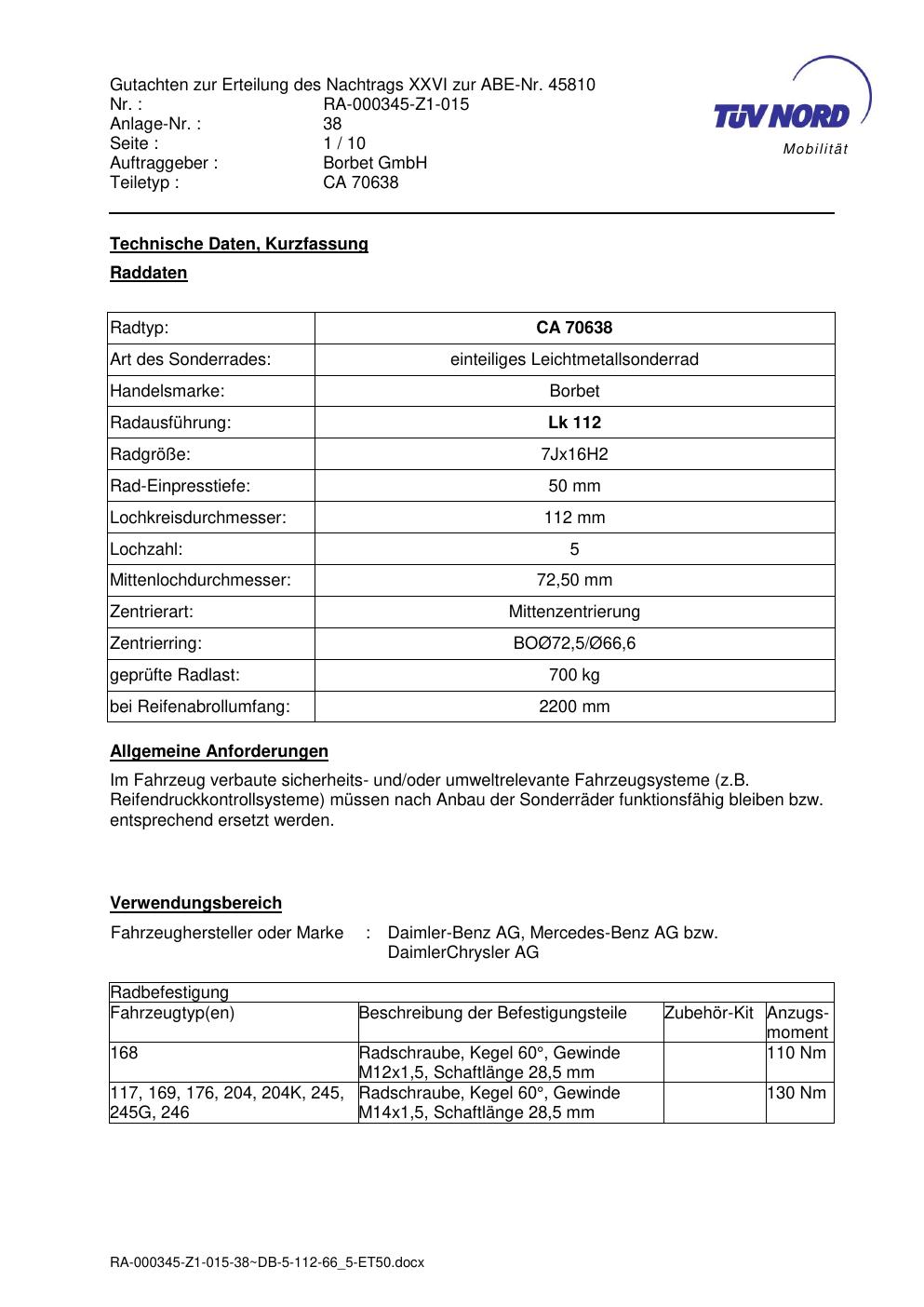 Dieses Gutachten (abe) bezieht sich auf die Alufelge Borbet CA 70638 in der Ausführung 7Jx16 ET 0, Mittenloch 0 mm (KBA 45810). Im PDF findest du typischerweise zulässige Reifengrößen, Auflagen/Anbauhinweise und – je nach Dokument – Hinweise zur Eintragung.