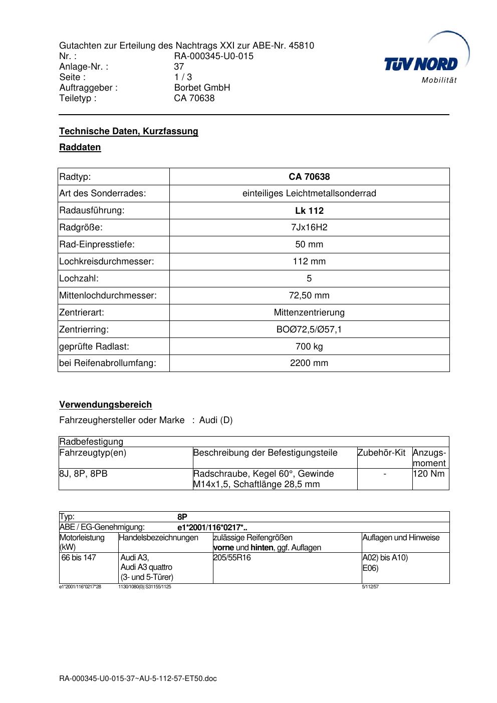 Dieses Gutachten (abe) bezieht sich auf die Alufelge Borbet CA 70638 in der Ausführung 7Jx16 ET 0, Mittenloch 0 mm (KBA 45810). Im PDF findest du typischerweise zulässige Reifengrößen, Auflagen/Anbauhinweise und – je nach Dokument – Hinweise zur Eintragung.
