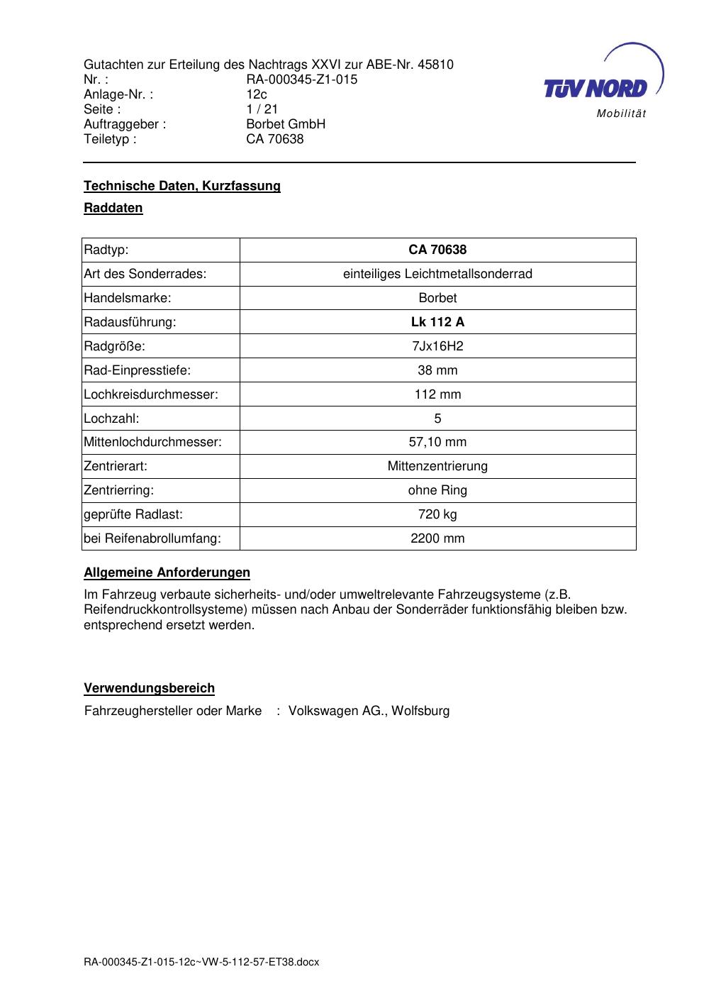 Dieses Gutachten (abe) bezieht sich auf die Alufelge Borbet CA 70638 in der Ausführung 7Jx16 ET 0, Mittenloch 0 mm (KBA 45810). Im PDF findest du typischerweise zulässige Reifengrößen, Auflagen/Anbauhinweise und – je nach Dokument – Hinweise zur Eintragung.
