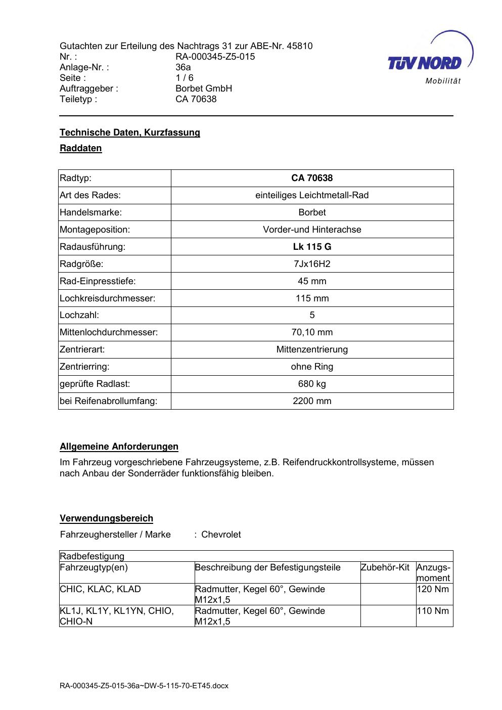 Dieses Gutachten (abe) bezieht sich auf die Alufelge Borbet CA 70638 in der Ausführung 7Jx16 ET 0, Mittenloch 0 mm (KBA 45810). Im PDF findest du typischerweise zulässige Reifengrößen, Auflagen/Anbauhinweise und – je nach Dokument – Hinweise zur Eintragung.