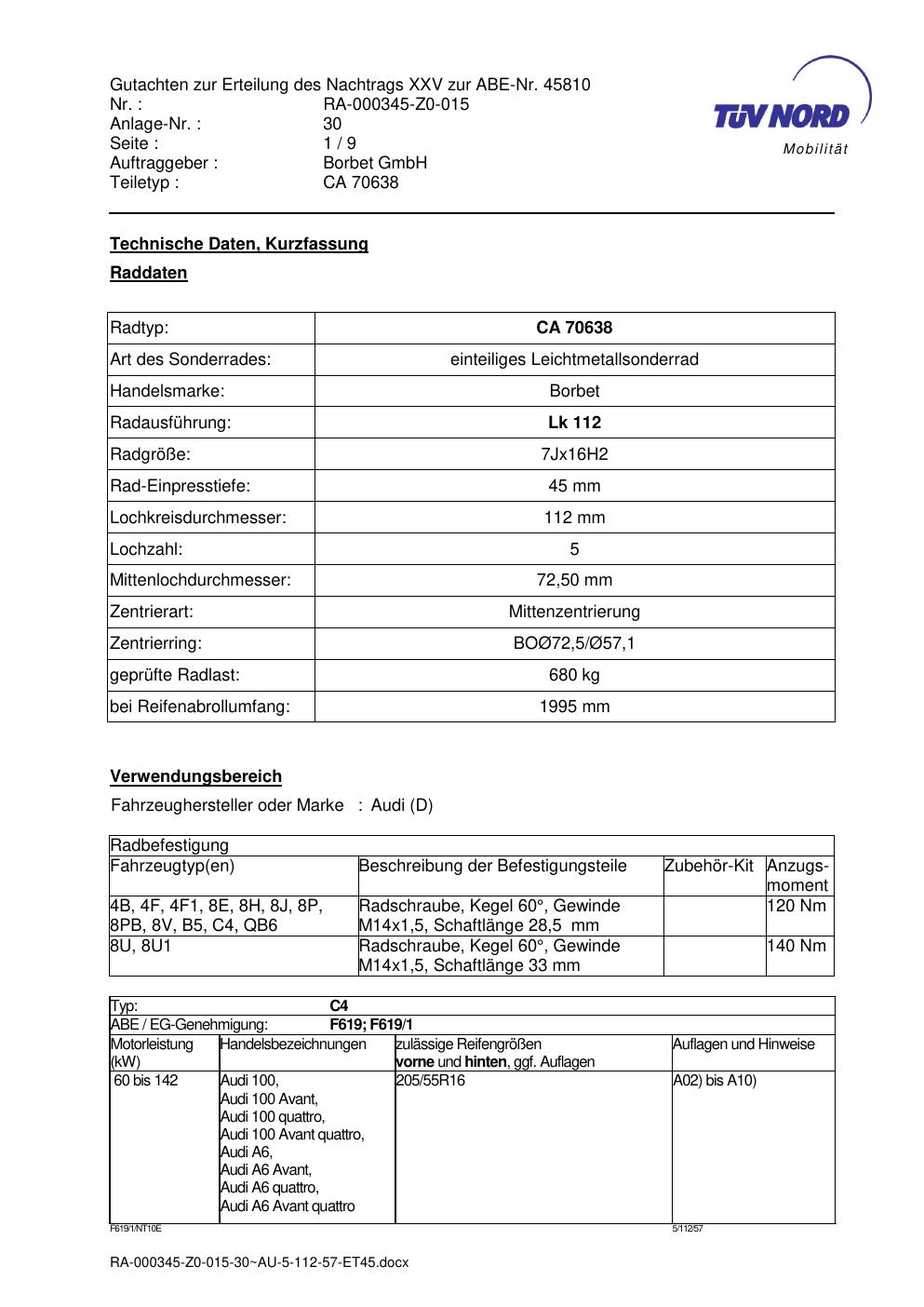 Dieses Gutachten (abe) bezieht sich auf die Alufelge Borbet CA 70638 in der Ausführung 7Jx16 ET 0, Mittenloch 0 mm (KBA 45810). Im PDF findest du typischerweise zulässige Reifengrößen, Auflagen/Anbauhinweise und – je nach Dokument – Hinweise zur Eintragung.