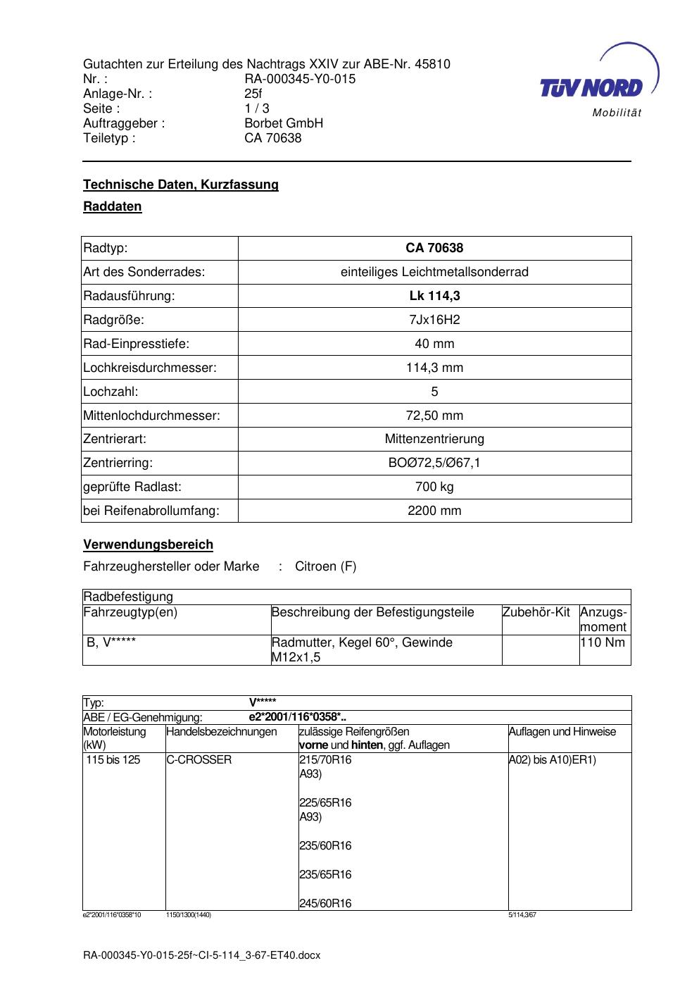 Dieses Gutachten (abe) bezieht sich auf die Alufelge Borbet CA 70638 in der Ausführung 7Jx16 ET 0, Mittenloch 0 mm (KBA 45810). Im PDF findest du typischerweise zulässige Reifengrößen, Auflagen/Anbauhinweise und – je nach Dokument – Hinweise zur Eintragung.