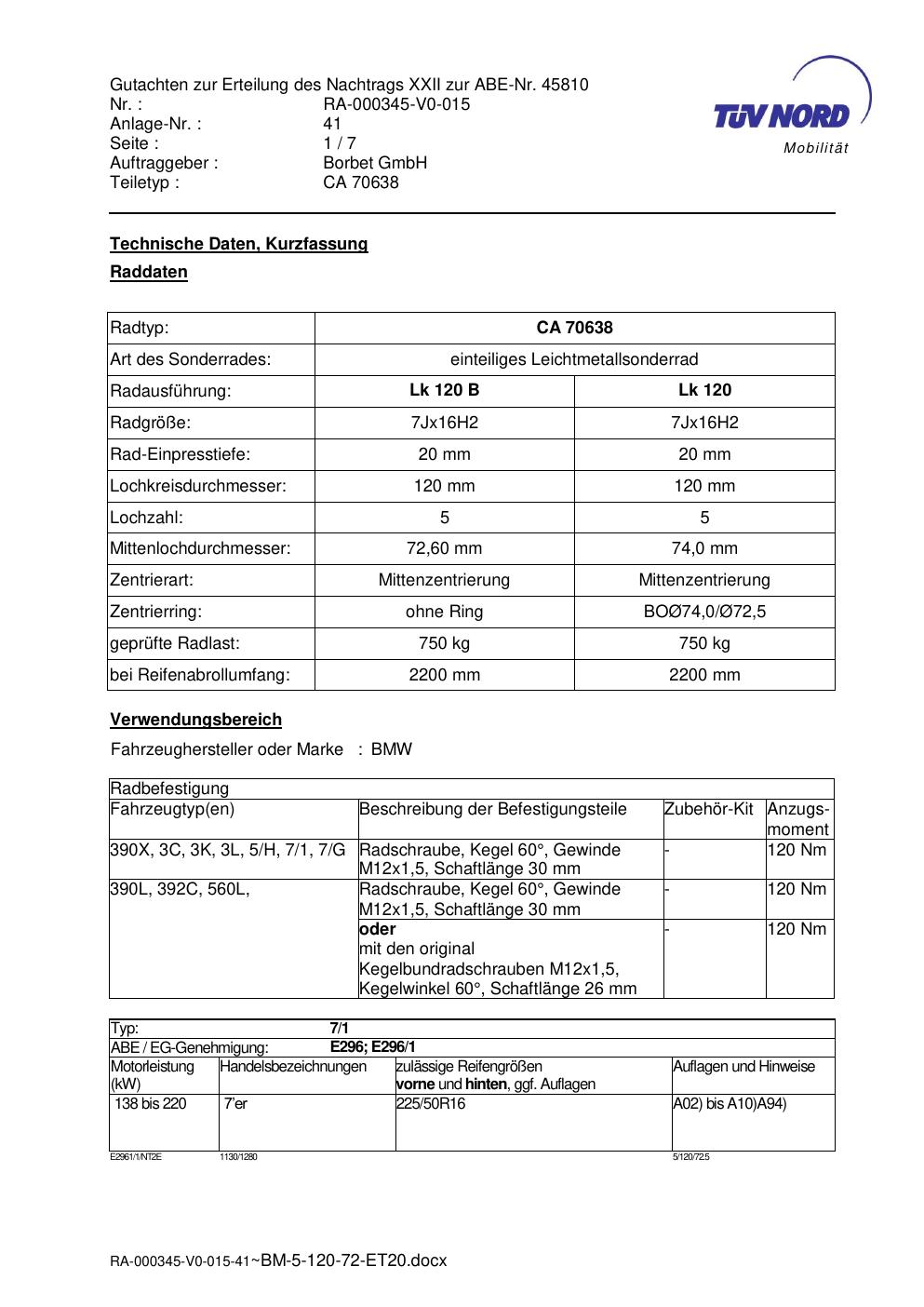 Dieses Gutachten (abe) bezieht sich auf die Alufelge Borbet CA 70638 in der Ausführung 7Jx16 ET 0, Mittenloch 0 mm (KBA 45810). Im PDF findest du typischerweise zulässige Reifengrößen, Auflagen/Anbauhinweise und – je nach Dokument – Hinweise zur Eintragung.