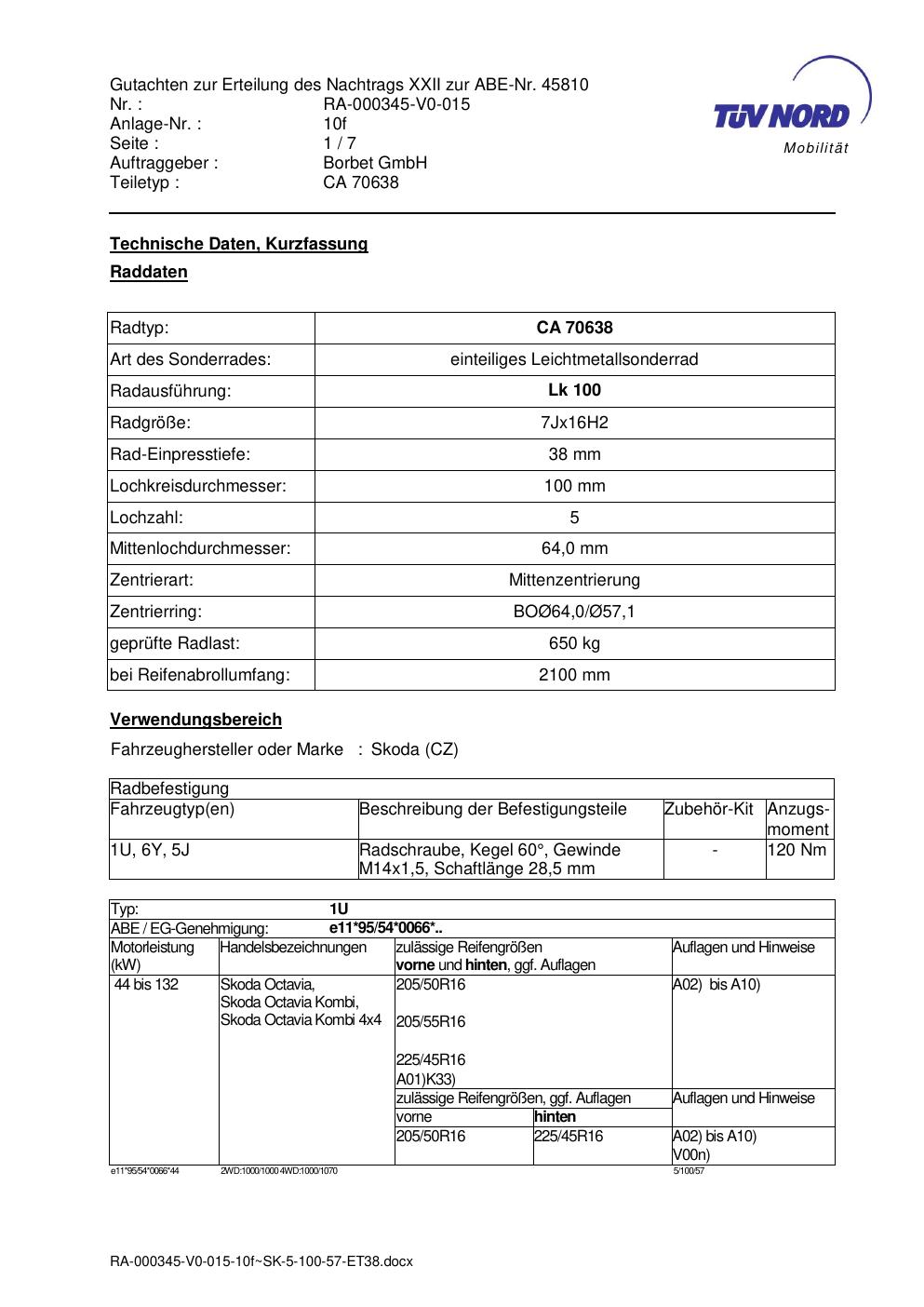 Dieses Gutachten (abe) bezieht sich auf die Alufelge Borbet CA 70638 in der Ausführung 7Jx16 ET 0, Mittenloch 0 mm (KBA 45810). Im PDF findest du typischerweise zulässige Reifengrößen, Auflagen/Anbauhinweise und – je nach Dokument – Hinweise zur Eintragung.