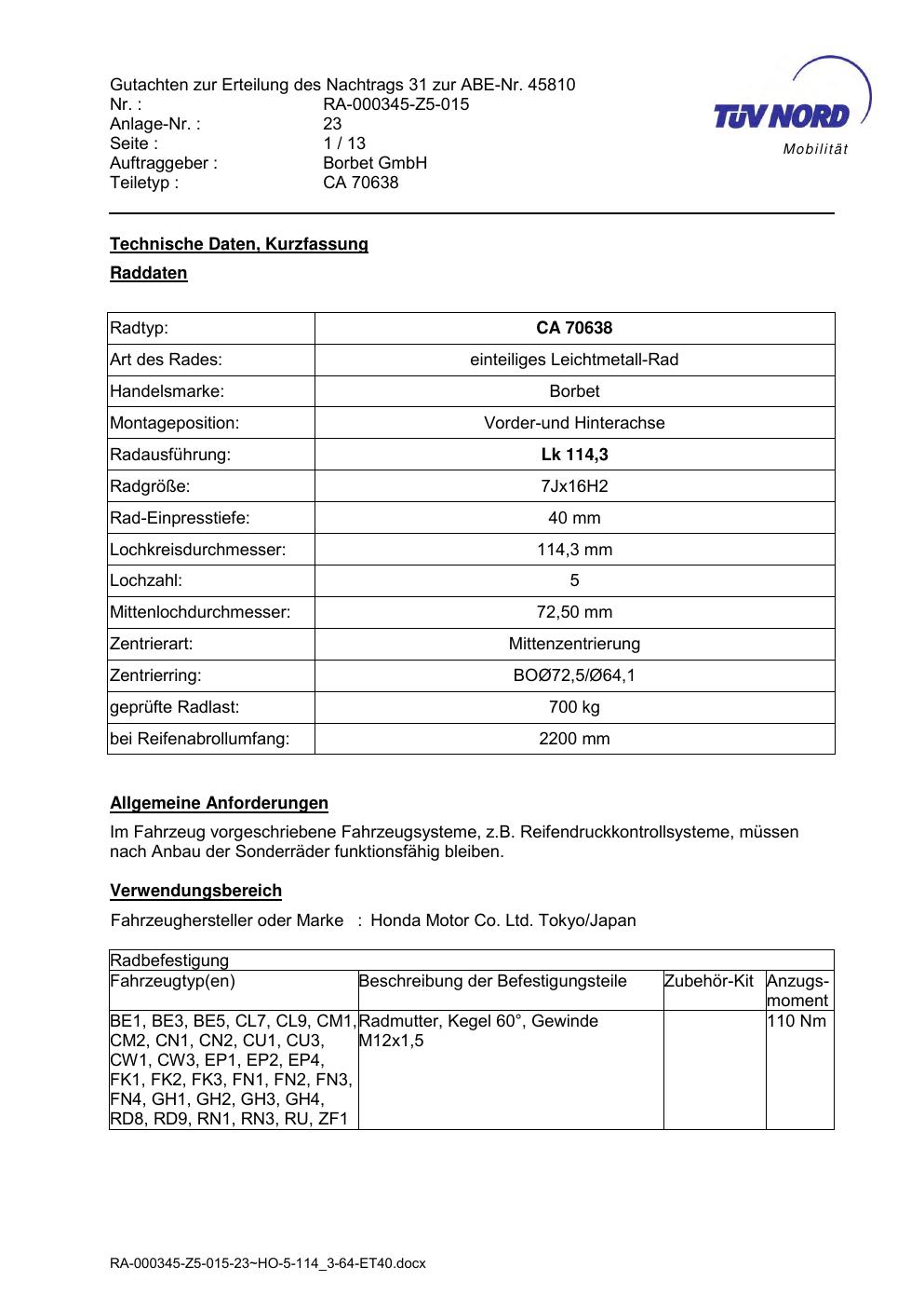 Dieses Gutachten (abe) bezieht sich auf die Alufelge Borbet CA 70638 in der Ausführung 7Jx16 ET 0, Mittenloch 0 mm (KBA 45810). Im PDF findest du typischerweise zulässige Reifengrößen, Auflagen/Anbauhinweise und – je nach Dokument – Hinweise zur Eintragung.