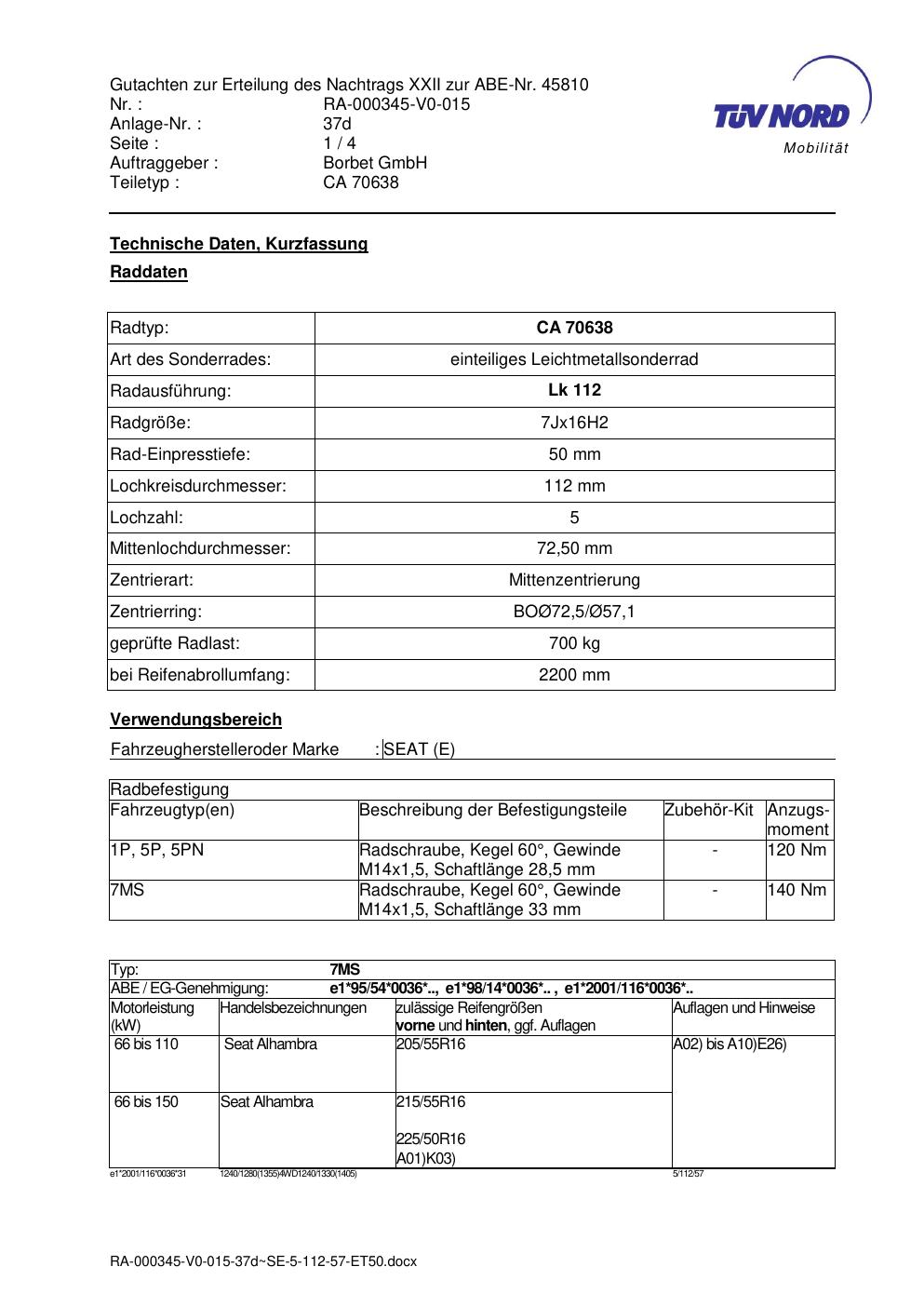 Dieses Gutachten (abe) bezieht sich auf die Alufelge Borbet CA 70638 in der Ausführung 7Jx16 ET 0, Mittenloch 0 mm (KBA 45810). Im PDF findest du typischerweise zulässige Reifengrößen, Auflagen/Anbauhinweise und – je nach Dokument – Hinweise zur Eintragung.