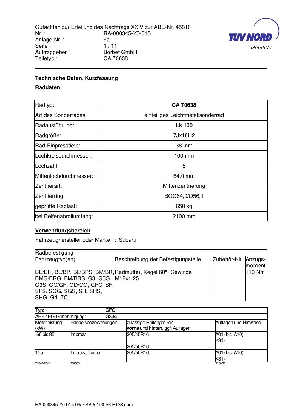 Dieses Gutachten (abe) bezieht sich auf die Alufelge Borbet CA 70638 in der Ausführung 7Jx16 ET 0, Mittenloch 0 mm (KBA 45810). Im PDF findest du typischerweise zulässige Reifengrößen, Auflagen/Anbauhinweise und – je nach Dokument – Hinweise zur Eintragung.