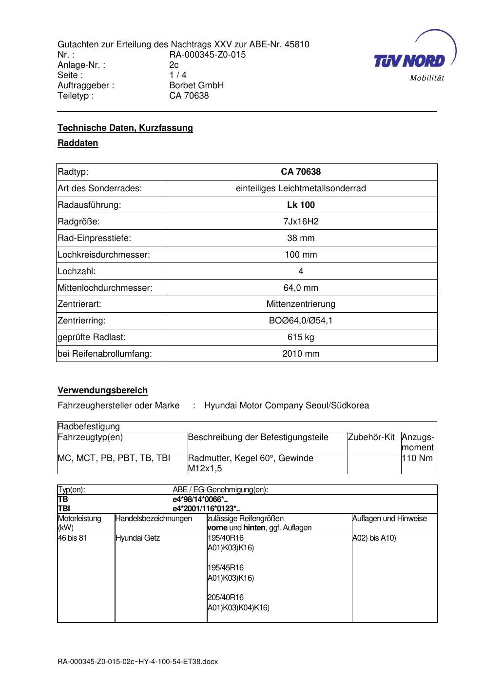 Dieses Gutachten (abe) bezieht sich auf die Alufelge Borbet CA 70638 in der Ausführung 7Jx16 ET 0, Mittenloch 0 mm (KBA 45810). Im PDF findest du typischerweise zulässige Reifengrößen, Auflagen/Anbauhinweise und – je nach Dokument – Hinweise zur Eintragung.