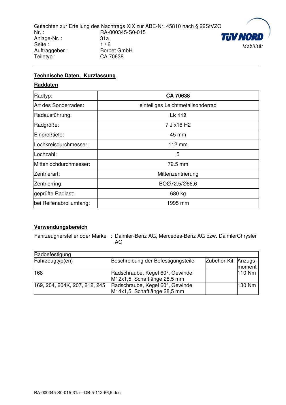Dieses Gutachten (abe) bezieht sich auf die Alufelge brand-borbet CA 70638 in der Ausführung 7Jx16 ET 0, Mittenloch 0 mm (KBA 45810). Im PDF findest du typischerweise zulässige Reifengrößen, Auflagen/Anbauhinweise und – je nach Dokument – Hinweise zur Eintragung.