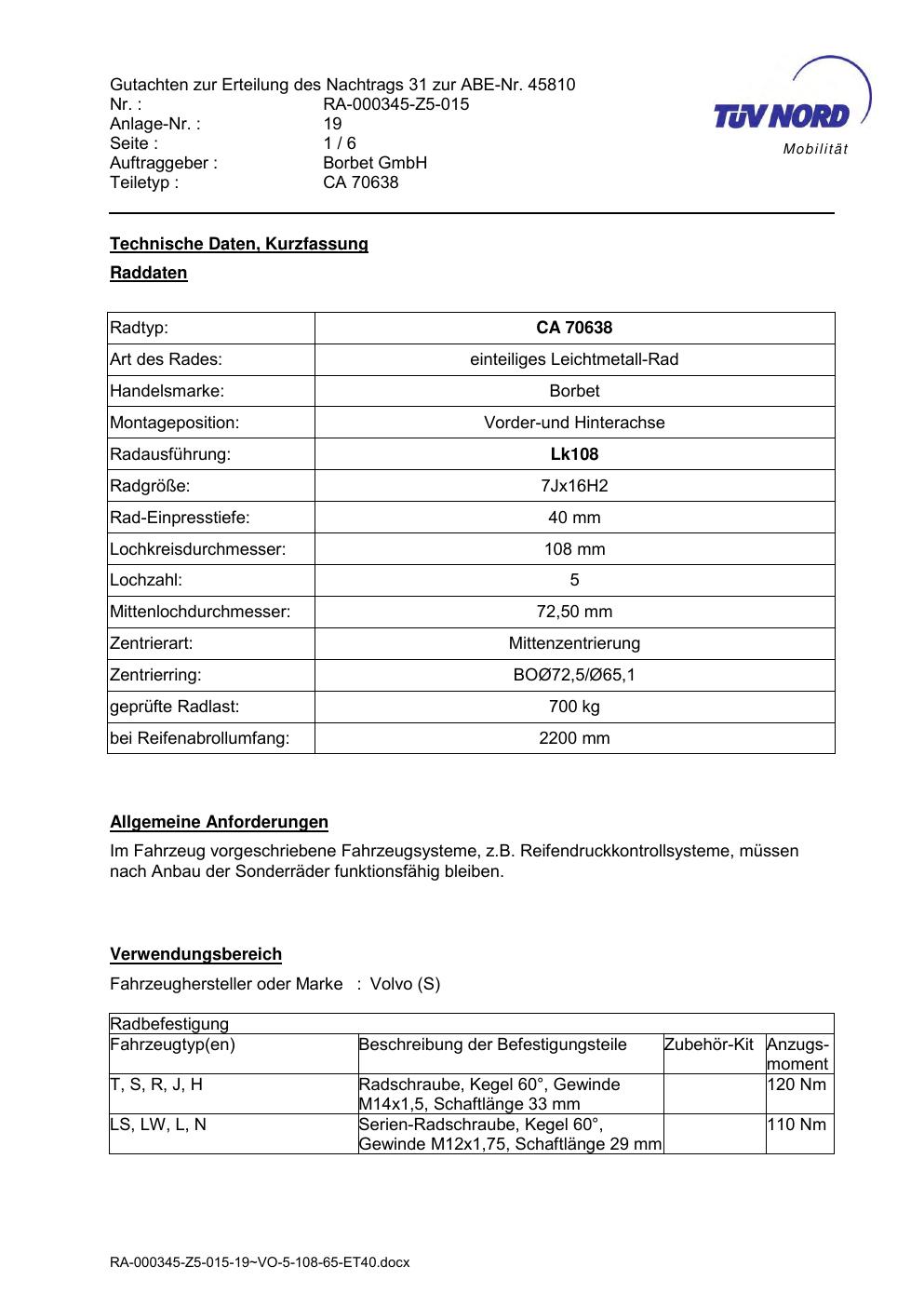Dieses Gutachten (abe) bezieht sich auf die Alufelge Borbet CA 70638 in der Ausführung 7Jx16 ET 0, Mittenloch 0 mm (KBA 45810). Im PDF findest du typischerweise zulässige Reifengrößen, Auflagen/Anbauhinweise und – je nach Dokument – Hinweise zur Eintragung.