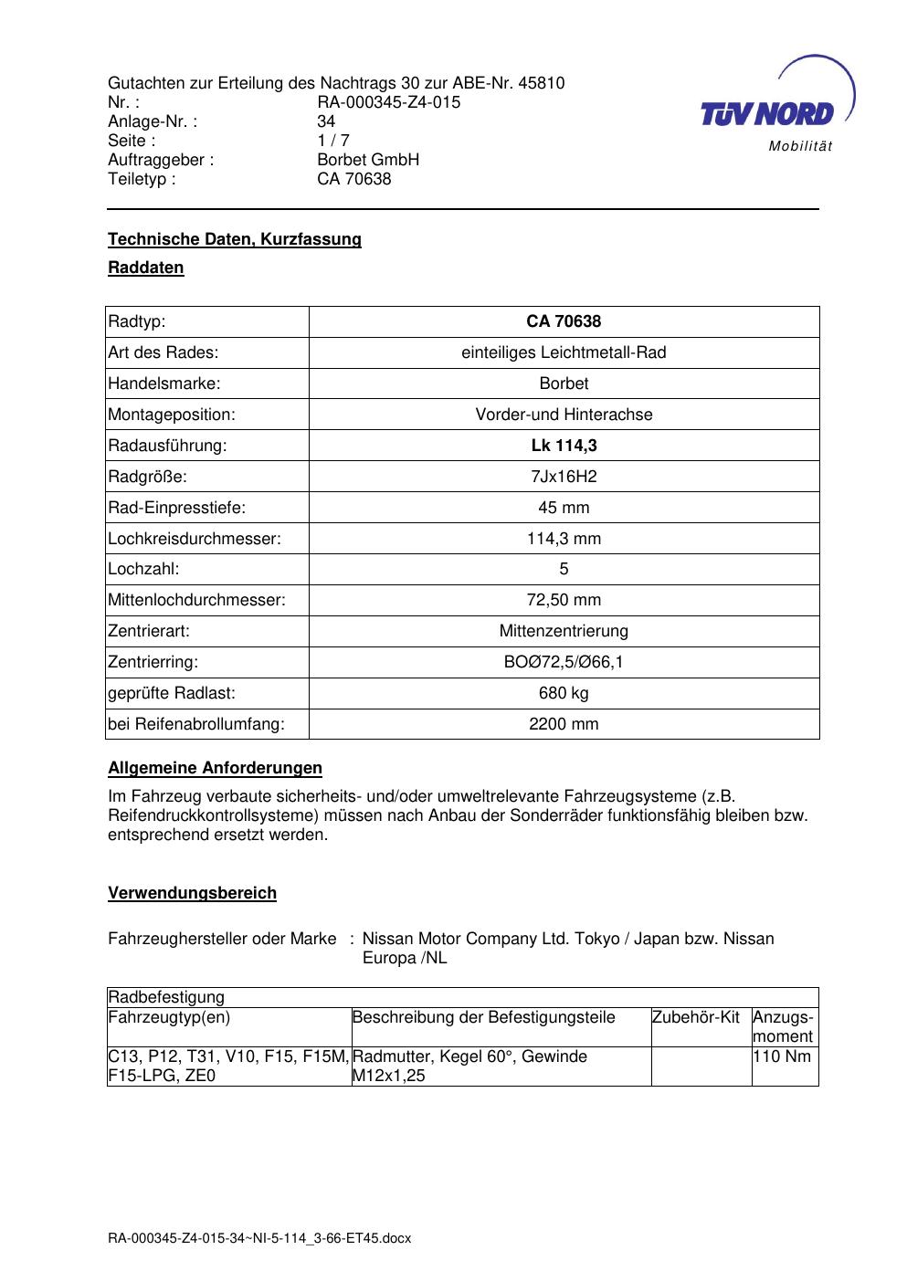 Dieses Gutachten (abe) bezieht sich auf die Alufelge Borbet CA 70638 in der Ausführung 7Jx16 ET 0, Mittenloch 0 mm (KBA 45810). Im PDF findest du typischerweise zulässige Reifengrößen, Auflagen/Anbauhinweise und – je nach Dokument – Hinweise zur Eintragung.