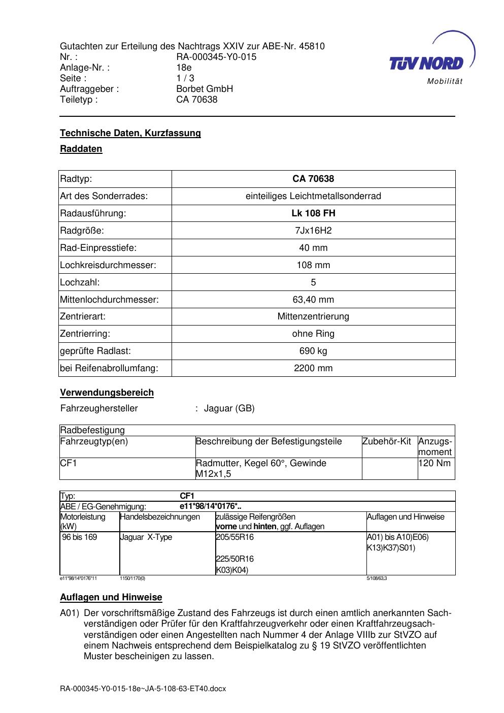 Dieses Gutachten (abe) bezieht sich auf die Alufelge Borbet CA 70638 in der Ausführung 7Jx16 ET 0, Mittenloch 0 mm (KBA 45810). Im PDF findest du typischerweise zulässige Reifengrößen, Auflagen/Anbauhinweise und – je nach Dokument – Hinweise zur Eintragung.