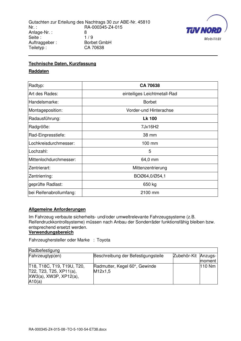 Dieses Gutachten (abe) bezieht sich auf die Alufelge Borbet CA 70638 in der Ausführung 7Jx16 ET 0, Mittenloch 0 mm (KBA 45810). Im PDF findest du typischerweise zulässige Reifengrößen, Auflagen/Anbauhinweise und – je nach Dokument – Hinweise zur Eintragung.