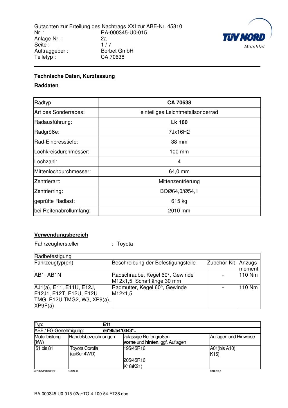 Dieses Gutachten (abe) bezieht sich auf die Alufelge Borbet CA 70638 in der Ausführung 7Jx16 ET 0, Mittenloch 0 mm (KBA 45810). Im PDF findest du typischerweise zulässige Reifengrößen, Auflagen/Anbauhinweise und – je nach Dokument – Hinweise zur Eintragung.