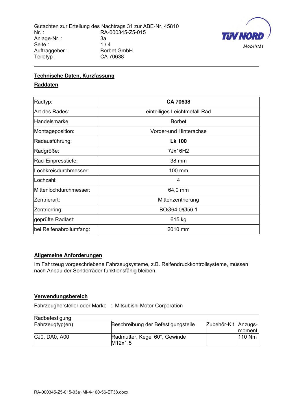 Dieses Gutachten (abe) bezieht sich auf die Alufelge Borbet CA 70638 in der Ausführung 7Jx16 ET 0, Mittenloch 0 mm (KBA 45810). Im PDF findest du typischerweise zulässige Reifengrößen, Auflagen/Anbauhinweise und – je nach Dokument – Hinweise zur Eintragung.