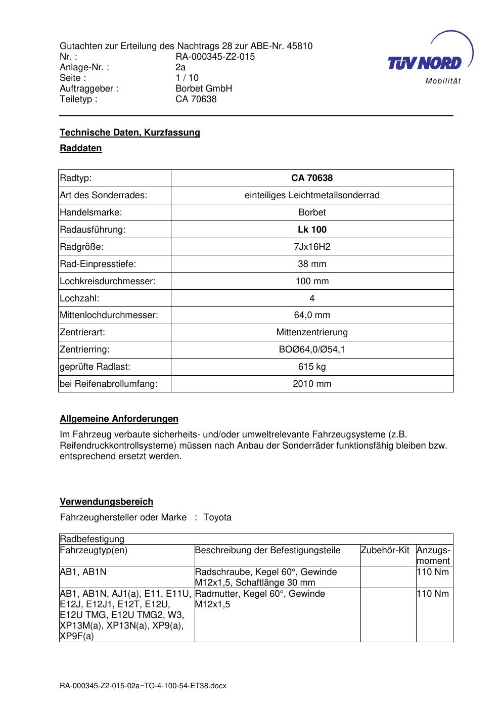 • Stimmt die KBA-Nummer auf der Felge mit diesem Dokument überein?