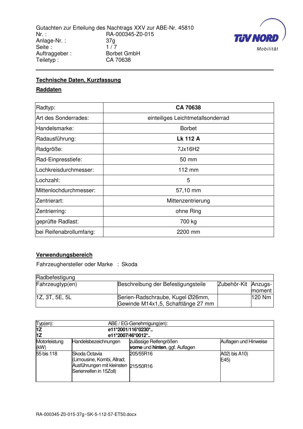 Dieses Gutachten (abe) bezieht sich auf die Alufelge Borbet CA 70638 in der Ausführung 7Jx16 ET 0, Mittenloch 0 mm (KBA 45810). Im PDF findest du typischerweise zulässige Reifengrößen, Auflagen/Anbauhinweise und – je nach Dokument – Hinweise zur Eintragung.