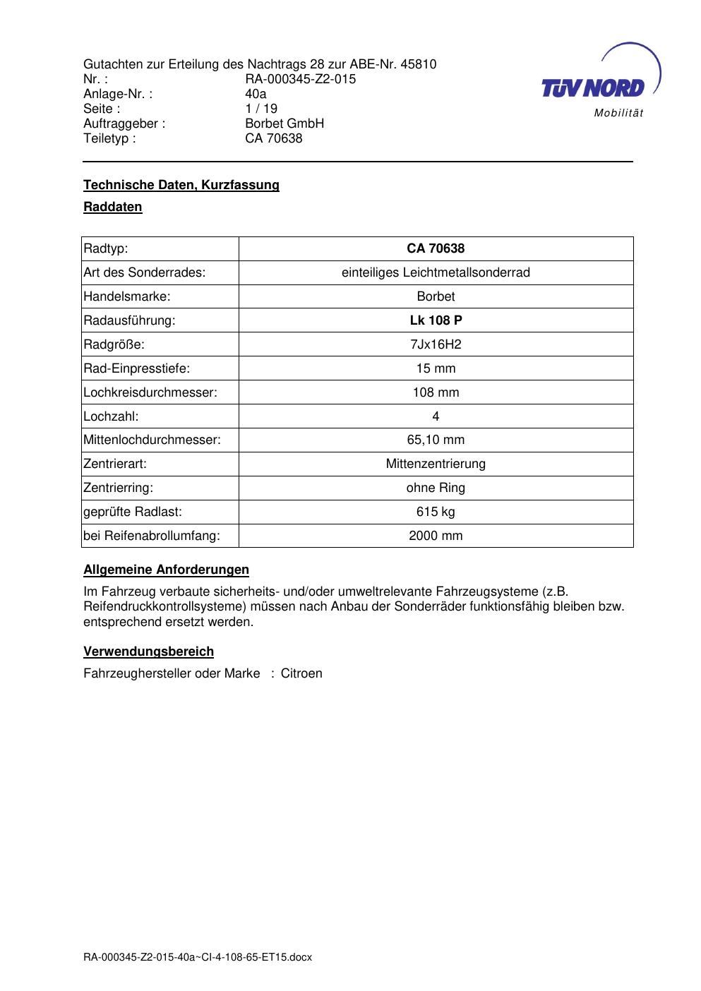 Dieses Gutachten (abe) bezieht sich auf die Alufelge Borbet CA 70638 in der Ausführung 7Jx16 ET 0, Mittenloch 0 mm (KBA 45810). Im PDF findest du typischerweise zulässige Reifengrößen, Auflagen/Anbauhinweise und – je nach Dokument – Hinweise zur Eintragung.