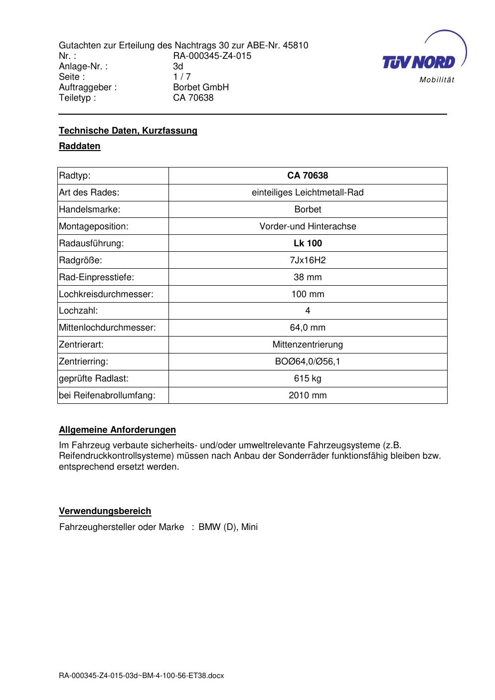 Dieses Gutachten (abe) bezieht sich auf die Alufelge Borbet CA 70638 in der Ausführung 7Jx16 ET 0, Mittenloch 0 mm (KBA 45810). Im PDF findest du typischerweise zulässige Reifengrößen, Auflagen/Anbauhinweise und – je nach Dokument – Hinweise zur Eintragung.