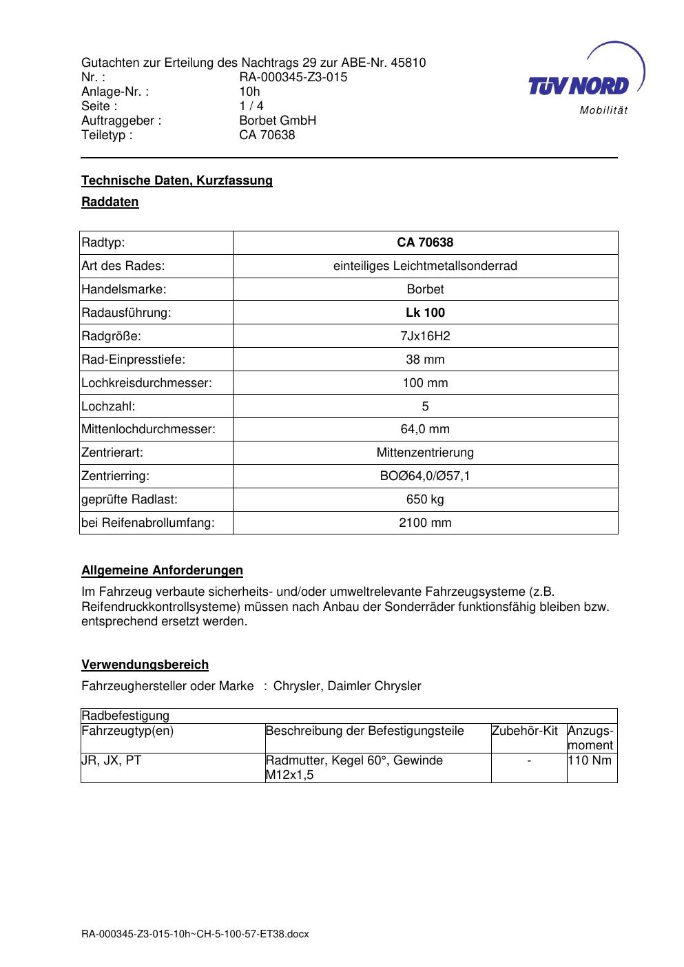 Dieses Gutachten (abe) bezieht sich auf die Alufelge Borbet CA 70638 in der Ausführung 7Jx16 ET 0, Mittenloch 0 mm (KBA 45810). Im PDF findest du typischerweise zulässige Reifengrößen, Auflagen/Anbauhinweise und – je nach Dokument – Hinweise zur Eintragung.