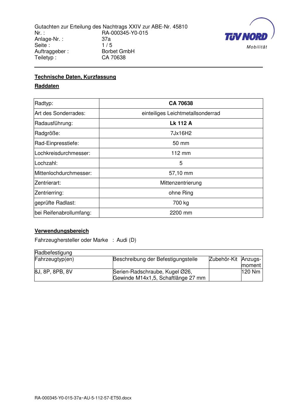 Dieses Gutachten (abe) bezieht sich auf die Alufelge Borbet CA 70638 in der Ausführung 7Jx16 ET 0, Mittenloch 0 mm (KBA 45810). Im PDF findest du typischerweise zulässige Reifengrößen, Auflagen/Anbauhinweise und – je nach Dokument – Hinweise zur Eintragung.