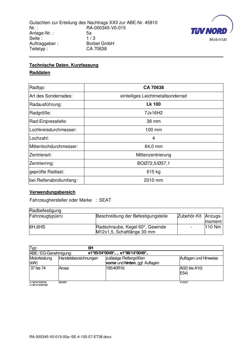 Dieses Gutachten (abe) bezieht sich auf die Alufelge Borbet CA 70638 in der Ausführung 7Jx16 ET 0, Mittenloch 0 mm (KBA 45810). Im PDF findest du typischerweise zulässige Reifengrößen, Auflagen/Anbauhinweise und – je nach Dokument – Hinweise zur Eintragung.